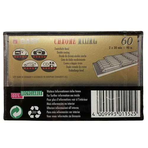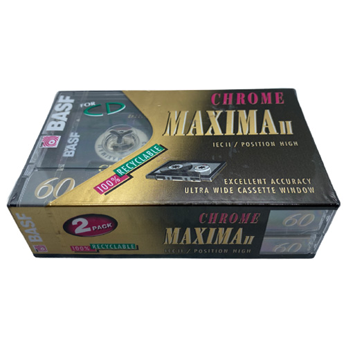Nové, zabalené audiokazety BASF Chrome Maxima II 60 min – 2 pack.  Špičkové chrom kazety na nahrávání.