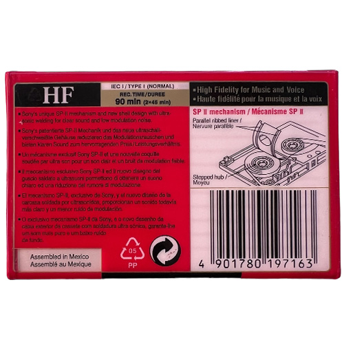 Nová zabalená audiokazeta SONY HF 90, Assembled in Mexico. Typ normal, vhodná kazeta pro nahrávání.