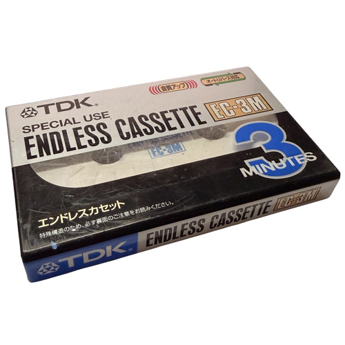 Nová, zabalená audiokazeta TDK Endless Cassette, délka 3 min. Tzv. nekonečná kazeta. Pozn.: Ošoupaný obal, viz foto.