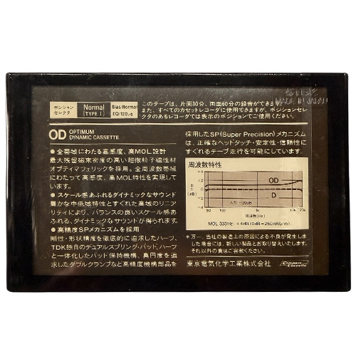 Nová, zabalená audiokazeta TDK OD 60 (1982-84 JPN). Audiokazeta TDK OD (Optimum Dynamic) z počátku 80. let patří k nejlepším ferro-páskům (Type I), které kdy opustily japonské továrny TDK. Byla navržena jako vyšší model nad populární řadou AD, s cílem poskytnout ještě širší frekvenční rozsah a vyšší dynamickou rezervu, což bylo v době před masivním rozšířením CD naprostou špičkou.